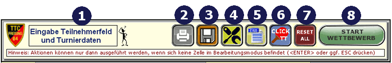 Das Titelfenster des Register zeigt diesen Zustand an. Initial befindet sich das Programm im Zustand (1). In diesem Modus können die Turnierdaten und die Teilnehmer des Wettbewerbs eingegeben werden. Nach dem Start des Wettbewerbs wir das Register in den Zustand (2) gesetzt und eine weitere Eingabe von Teilnehmern unterbunden.