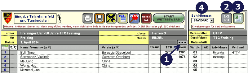 Durch Anklicken des Buttons für die Verbanderweiterung (1) werden weitere Eingabefelder (Startnummer, Altersklasse, Spielklasse, Verband) für Spielerattribute ein- und ausgeblendet. Weitere Felder können auf Wunsch individuell hinzugefügt werden. Zusätzlich stehen in der erweiterten Menüleiste spezielle Befehle zur Verfügung: