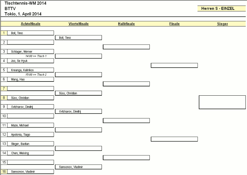 Die nachfolgende Abbildung zeigt ein Beispiel eines Excelexports (KO-Baum einer Endrunde). Neben den Spielernamen sind Informationen über die Spielzeit sowie Tischinformationen hinterlegt.