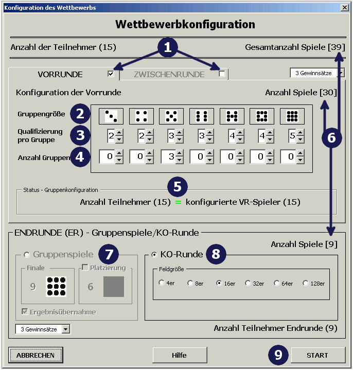 Als Endrunden-Spielsystem können entweder Gruppenspiele (beschränkt auf 12 Endrunden-Teilnehmer) oder eine KO-Runde ausgewählt werden. Gestartet wird der Wettbewerb durch den Button “START” (9) . Dieser ist aktiviert (anklickbar), sobald eine gültige Konfiguration eingestellt ist. Die Anzahl der Gewinnsätze (2, 3 oder 4) kann für jede Spielphase separat eingestellt werden. Eine Ergebnisübernahme von einer Spielphase zur nächsten (z.B. von der Vorrunde zur Zwischenrunde) ist jedoch nur bei gleicher Anzahl von Gewinnsätzen möglich.