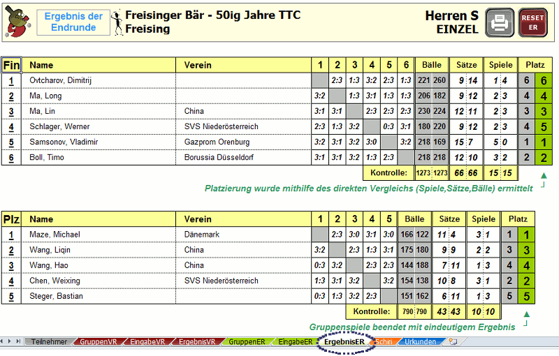 Durch einen Klick auf den START Button wird das Register GruppenER aktiviert. Im Beispiel (Abbildung 32) wurde mit einer Trostrunde gespielt, d.h. es gibt eine Finalgruppe (Fin) (1) und eine Platzierungsgruppe (Plz) (2) in der die letztplazierten Gruppenteilnehmer der Vorrunde gelistet sind.