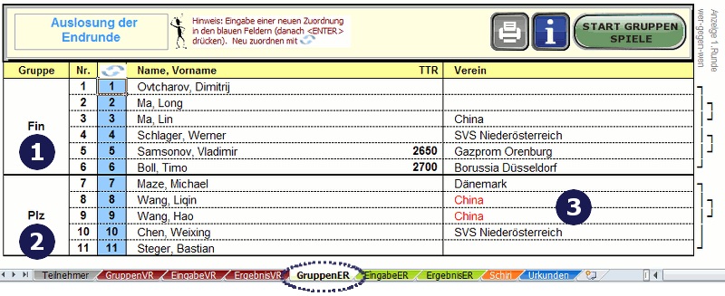 Neben den Namen und Vornamen werden zusätzlich die Vorrundengruppe (oder die Gruppe der Zwischenrunde), die finale Platzierung (3) und der Verein (4) des Spieler dargestellt.