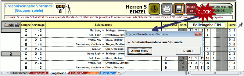 Die Auslosung der Gruppen-Endrunde wird durch Anklicken des Buttons START AUSLOSUNG ENDRUNDE im Register EingabeVR angestoßen. Es erscheint ein Dialog zur Übernahme der Daten aus der Vorrunde, wenn Vorrunde und Endrunde mit gleicher Anzahl von Gewinnsätzen konfiguriert wurden.