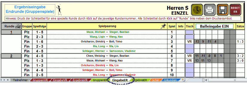 Abbildung 33 zeigt eine Gruppen-Endrunde Ergebniseingabe. Das Register EingabeER ist wie das Eingaberegister der Vorrunde bzw. der Zwischenrunde aufgebaut. Im Beispiel wurden die Ergebnisse der Spiele 3,6 und 7 aus der Vorrunde übernommen.
