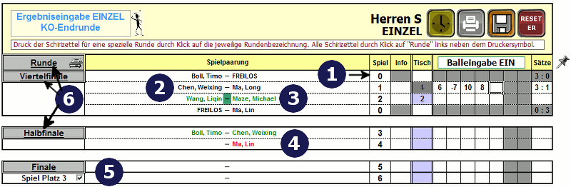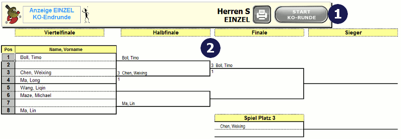 Die Anzeige des Vereinsnamen und der Gruppenzugehörigkeit wird ausgeblendet. Die Ergebnisse (Sätze) der KO-Rundenspiele werden neben den Spielern eingetragen (2). Spieler die Freilose haben, kommen automatisch eine Runde weiter (ohne Ergebniseintragung).