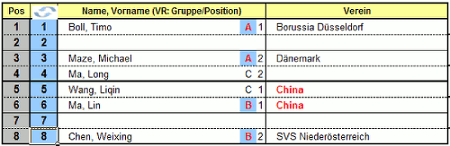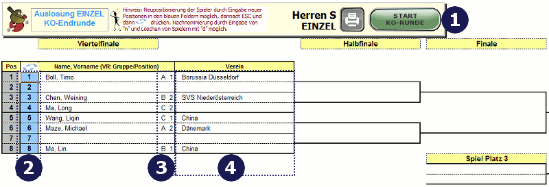 Wie bei der Konfiguration/Auslosung der Vorrunde können auch hier die Teilnehmerneu platziert werden durch Eingabe neuer Positionsnummern in der blauen Markierungsspalte und anschließendem Anklicken des Zuordnen-Buttons. Vereinsgleiche Spieler (siehe (3)) werden rot gekennzeichnet und vom Programm initial so gesetzt, dass diese in der ersten Runde aufeinander treffen.