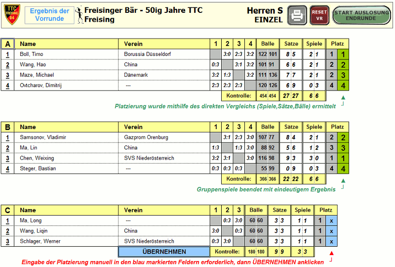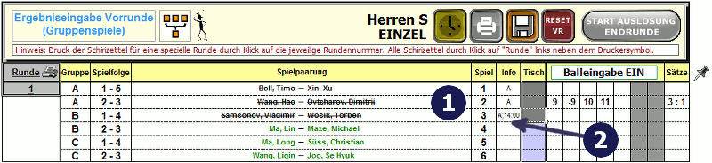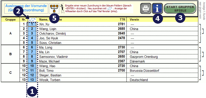 Über die blauen Eingabefelder (1) kann die Zuordnung der Teilnehmern zu Gruppen oder ihre Positionierung innerhalb einer Gruppe korrigiert werden. Geben Sie in die blauen Eingabefelder einfach die gewünschte Position des Teilnehmers ein. Beispielsweise beiPosition 1 die 6 und bei Position 6 die 1, damit werden die Spieler Ma Long und Wang Hao in ihren Positionen vertauscht. Möglich sind einfache Vertauschungen und Ringvertauschungen.