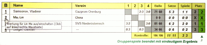 Durch Anklicken der Positionsnummer im Register für die Gruppenergebnisse (siehe Abbildung 26) wird der entsprechende Spieler (im Beispiel Ma Lin) aus der Wertung genommen. Es erscheint ein “X” bei der Platzierung, der Spieler wird durchgestrichen dargestellt und alle Spielpaarungen des Spielers werden im Ergebniseingabe-Register mit dem Annullierungskennzeichen “A” versehen (vgl. vorherigen Abschnitt). Eine Spielannullierung kann aufgehoben werden mit durch einen Click mit der rechten Maustaste auf die Positionsnummer oder durch löschen jedes einzelnen Annullierungskennzeichen im Ergebniseingabe-Register.