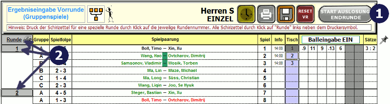 Das Turnierprogramm setzt alle Begegnungen bei denen eine Tischnummer eingetragen ist, jedoch noch kein Ergebnis eingegeben wurde auf den Status “running” - siehe (2). Die Turnierleiter könne so sehr schnell erkennen, welche Spiele gerade gespielt werden und welche als nächstes aufrufbar sind. Diese Information wird aber auch für die übergreifende Verfügbarkeitsanzeige von Teilnehmern verwendet, die in einem Doppel- und Einzelwettbewerb (gleichzeitig) spielen.